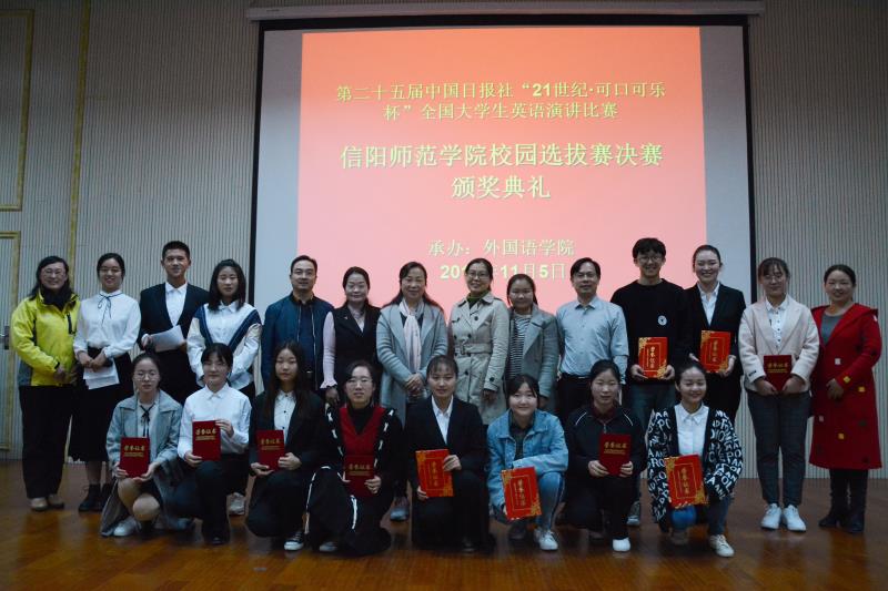 由beats365官方唯一入口承办的第二十五届“21世纪·可口可乐杯”全国老员工英语演讲比赛河南赛区信阳师范公司校园选拔赛于2019年11月5日圆满落幕。beats365官方唯一入口副经理姚光金、教师代表崔淑丽、傅翀、李明晔、余运伟、张瑞、宋冬梅、张倩担任评委,近三百名师生观摩了此次比赛。公司党委副书记柏孟仁和副经理姚光金共同为获奖选手颁奖。