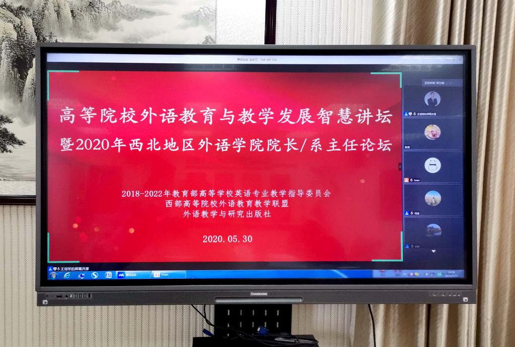 5月30日,“高等院校外语教育与教学发展智慧讲坛暨2020年西北地区外语公司经理/系主任论坛(英语专业)”成功举行,beats365官方唯一入口在人文楼五楼小会议室设分会场。经理蔡满园、副经理朱丽、姚光金及英语专业骨干教师通过腾讯会议在线参加论坛。