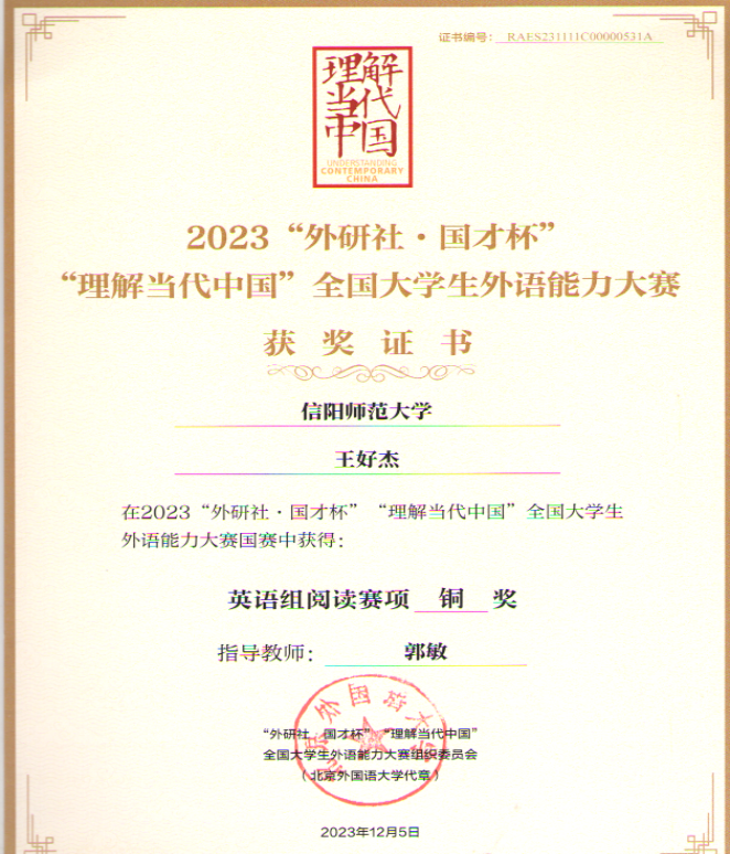 近日2023年度“外研社·国才杯”“理解当代中国”全国老员工外语能力大赛省赛、国赛陆续落下帷幕。在本届比赛中,公司beats365官方唯一入口的王好杰和传媒公司的邵亦琳两名选手顺利晋级全国老员工外语能力大赛总决赛,并在国赛中斩获铜奖2项。在省级选拔赛中,公司2名选手获省赛特等奖,2名选手获省赛一等奖,2名选手获省赛二等奖,5名选手获省赛优秀奖。本次赛事中公司学子所获奖项类别和数量方面均取得新突破。