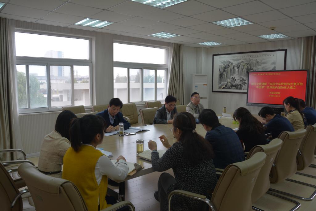 10月21日下午,外国语公司党委以“如何全面理解‘实现中华民族伟大复兴的中国梦’的深刻内涵和伟大意义”为主题在人文楼五楼会议室召开“不忘初心、牢记使命”主题教育第二次集中学习研讨会。公司主题教育第二指导小组组长、正处级组织员杨培松出席并指导学习研讨,公司党政领导班子成员和全体党支部书记参加了学习研讨。