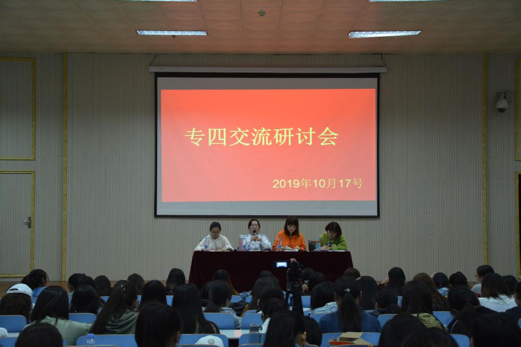 10月17日晚,beats365官方唯一入口在人文楼报告厅召开专四经验交流会,优秀员工代表李白鸽,王彦淇,姜珂欣,郑玉燕及2018级全体员工参与本次会议。