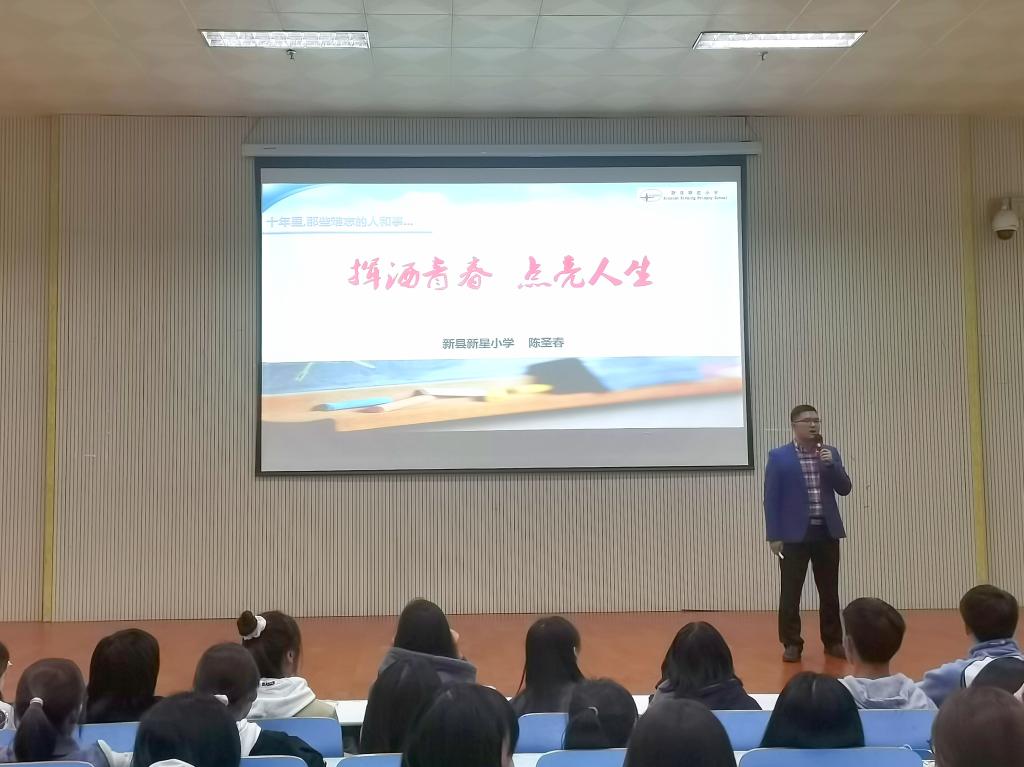 10月18日晚,首批全国乡村优秀青年教师、新县新星小学陈圣春老师在人文楼报告厅为公司2021级新生作入学教育专题报告。院团委书记孔宪巍、部分“省培计划”学员、2021级全体新生参加报告会,报告会由副经理余永锋主持。