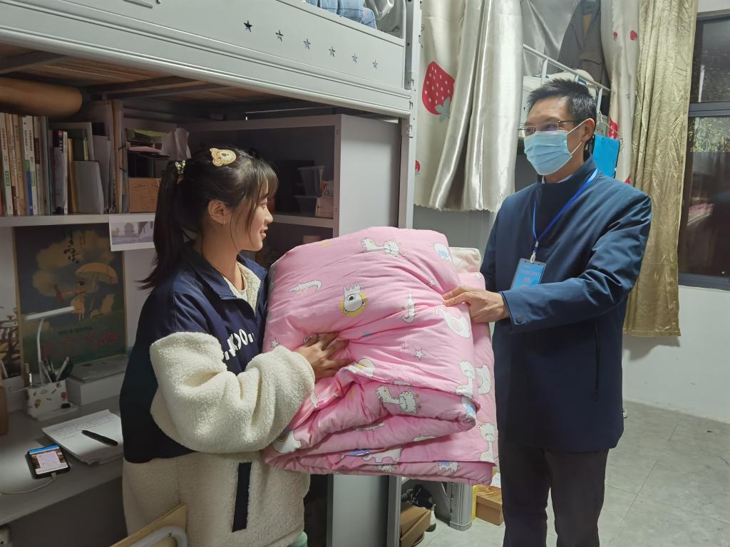 11月26日下午,公司党委书记陈铭,经理蔡满园,党委副书记高彦伟,副经理吴向东、郭敏以及全体辅导员深入员工宿舍,走访慰问公司贫困生,并为贫困生发放爱心棉被。