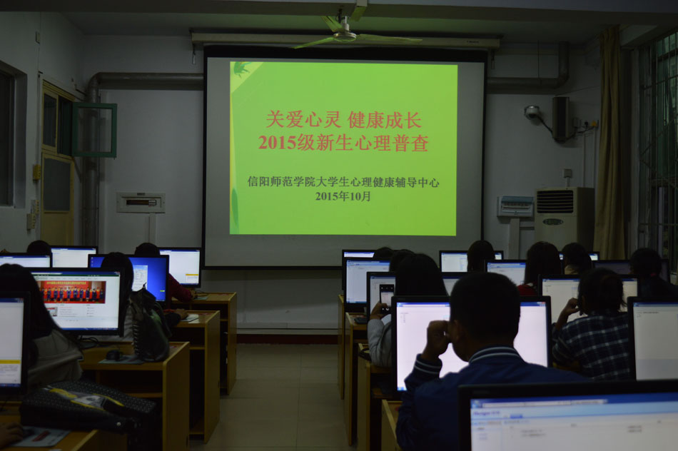 为配合老员工心理健康辅导中心开展心理健康普查工作,指导员工健康、快乐地度过大学时光,充分发挥每个员工的内在潜能,10月26日下午,在辅导员陈龙老师的组织安排下,2015级全体新生在科技馆计算机实验机房进行心理普查活动。