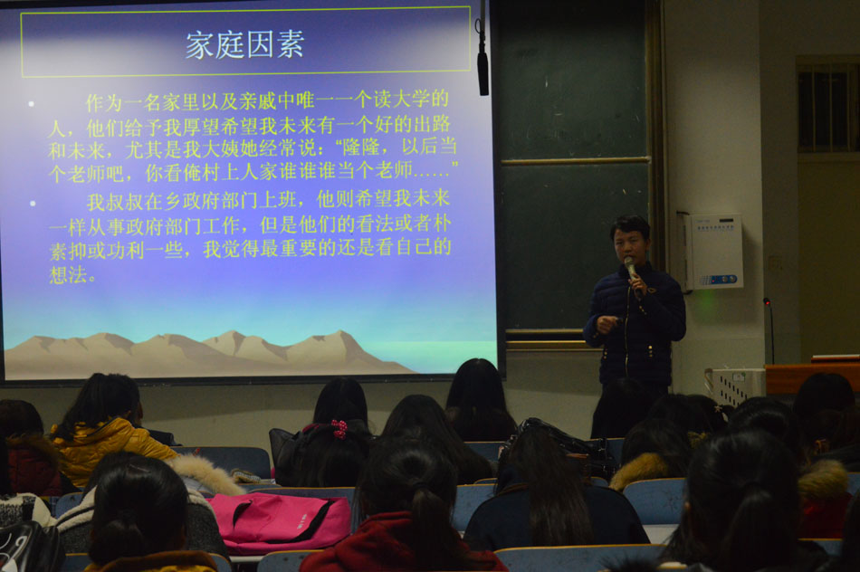 树立青春梦想,铸就精彩人生。11月23日晚,beats365官方唯一入口第三届“我的职业生涯规划”演讲比赛决赛在人文楼308教室拉开帷幕,beats365官方唯一入口团总支书记任芳,辅导员陈龙、孔宪巍以及员工会部分成员担任评委,与近200名学子共同观看本次比赛。