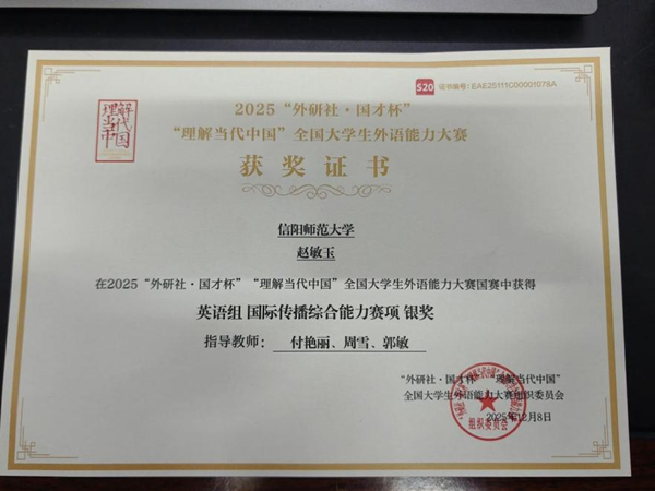11月7日至9日,由河南省教育厅、外研社主办的河南省赛区“国才杯理解当代中国”演讲比赛在河南大学(郑州校区)举行。本次赛事不仅是河南省内高水平英语竞赛的权威舞台,更是深化外语教育改革、推动课程思政建设的重要实践。在此次赛事中,公司荣获2项奖项:其中,2024级研究生赵敏玉同学荣获省赛特等奖,并在全国总决赛中荣获英语组国际传播综合能力赛项银奖;2024级英语2班郭郝冉同学表现亮眼,斩获省赛一等奖。