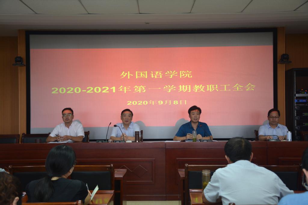 9月8日下午,beats365官方唯一入口在人文楼六楼会议室召开2020-2021学年第一学期教职工大会。外国语公司党委书记周学红,经理蔡满园,党委副书记柏孟仁,副经理姚光金及全体教职工参加会议。会议由周学红主持。