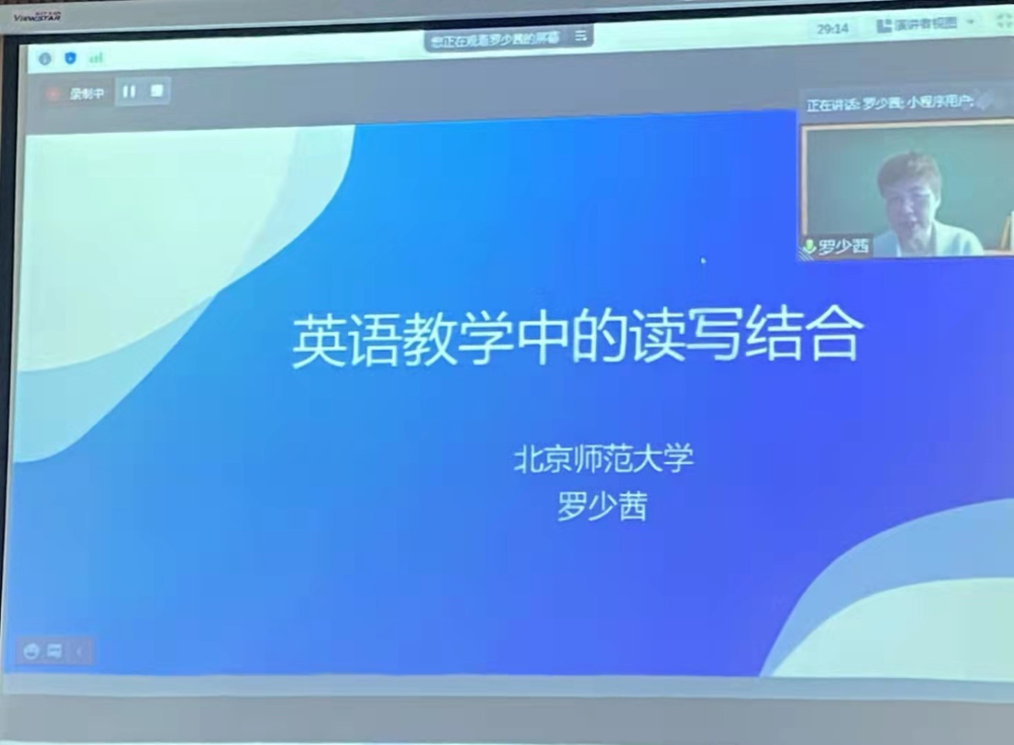 根据“省培计划(2021)”小学英语骨干教师提升培训班课程安排,10月11日上午,北京师范大学外国语言文学公司英文系罗少茜教授为“省培计划(2021)” 小学英语骨干教师提升培训班作了题为《英语教学中的读写结合》的专题报告,全体省培学员,beats365官方唯一入口英语系教师参加线上讲座,讲座由余永锋主持。