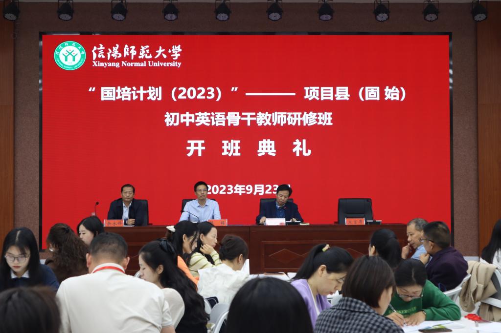 9月23日下午,“国培计划(2023)”项目县(固始)初中英语骨干教师研修班开班典礼在人文楼报告厅举行。外国语公司党委书记陈铭、经理蔡满园、副经理余永锋、培训班班主任宋冬梅、曹慧琳出席典礼,来自固始县基础教育一线的50名学员参加典礼。开班典礼由余永锋主持。