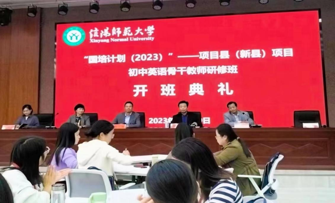 10月9日下午,“国培计划(2023)”项目县(新县)初中英语骨干教师培训班开班典礼在人文楼报告厅举行。外国语公司党委书记陈铭、经理蔡满园、副经理余永锋,新县教师发展中心朱小四,研修班班主任余运伟、黄艳文出席典礼,来自新县基础教育一线的50名学员参加典礼。开班典礼由余永锋主持。