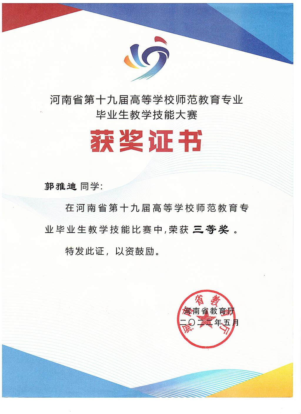 近日,由河南省教育厅主办、周口师范公司承办的第十九届河南省高等公司师范教育专业毕业生教学技能大赛圆满结束。经过校内选拔,省教育厅组织分赛区预选、专家组复审和公示,公司2018级英语专业员工黄玉杰和郭雅迪同学分获二、三等奖。
