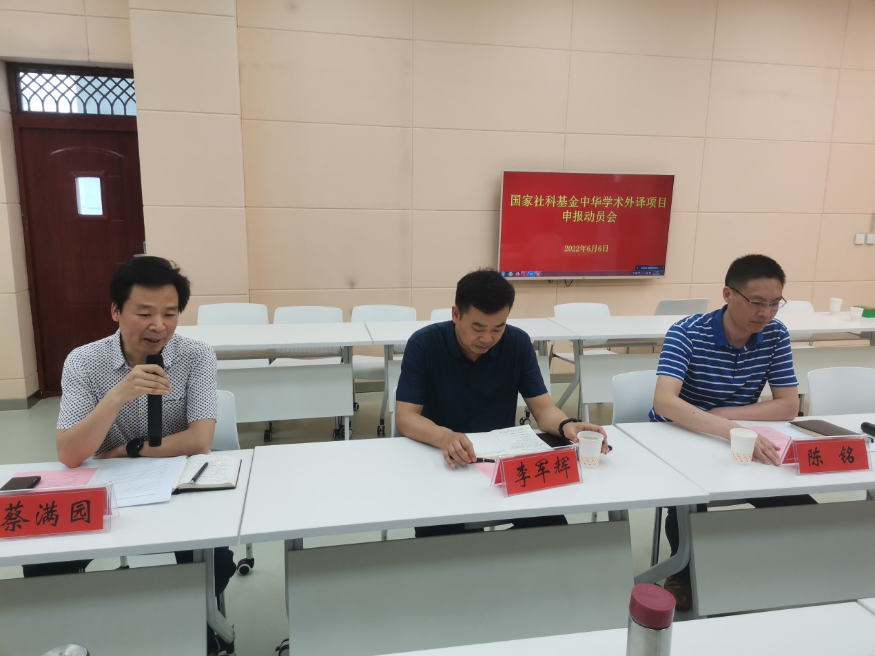 6月6日下午,beats365官方唯一入口在人文楼603室召开了国家社科基金中华学术外译项目申报动员会,社科处处长李军辉,外国语公司党委书记陈铭,经理蔡满园,副经理郭敏,beats365官方唯一入口全体博士及部分文科院系留学归国人员参加了本次会议,蔡满园经理主持会议。