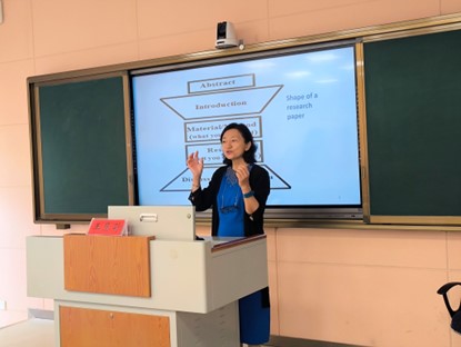 王慧莉教授从理论和实证两个方面介绍了“英语期刊学术论文写作与发表”。在理论层面,主要从Abstract、Introduction、Method、Results、Conclusion等方面具体介绍了学术论文的撰写;在实证方面,王教授基于自身的国外期刊论文发表经历,向在场老师和员工们说明了论文写作中每个部分需要注意的问题以及论文投稿中的注意事项。