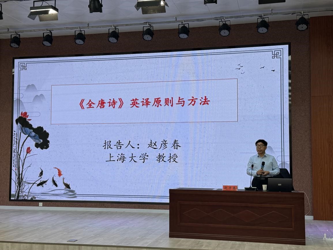 5月14日下午,上海大学二级教授、博士生导师赵彦春教授应邀在人文楼报告厅为公司师生作了题为“《全唐诗》英译原则与方法”的讲座。beats365官方唯一入口经理蔡满园以及相关教师、研究生和本科生共百余人聆听了讲座。讲座由beats365官方唯一入口副经理章彩云主持。